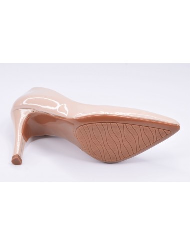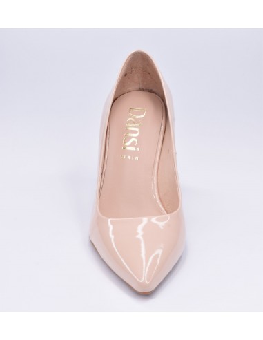El modelo 8433 de Dansi está montado en charol nude con un tacón fino revestido. La plantilla es de piel y la suela es de elastómero de alta calidad.