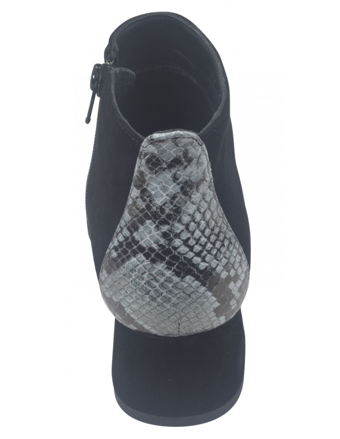 La parte superior está hecha de dos materiales: ante negro en la parte delantera y piel de reptil azul y negra en la trasera. La parte superior mide 8 cm de alto y el contorno del tobillo (medida tomada en la parte superior de la caña en una talla 34) mide 25 cm. Es fácil de poner gracias a una cremallera en el interior de la bota
