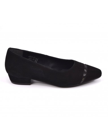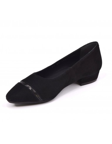 Si buscas un zapato estilo bailarina cómodo para tus pies pequeños, ¡este zapato de tacón pequeño está hecho para ti! Montado sobre un pequeño tacón cuadrado revestido de ante, su altura es de 2 cm. El ancho del ajuste es de 7,5 cm (ancho estándar). La parte superior está hecha de ante negro. Su planta interior es de piel y su suela exterior es de goma antideslizante de alta calidad. la parte delantera de la pala está cubierta con un ribete de piel viperina negra. La punta es semipuntiaguda.