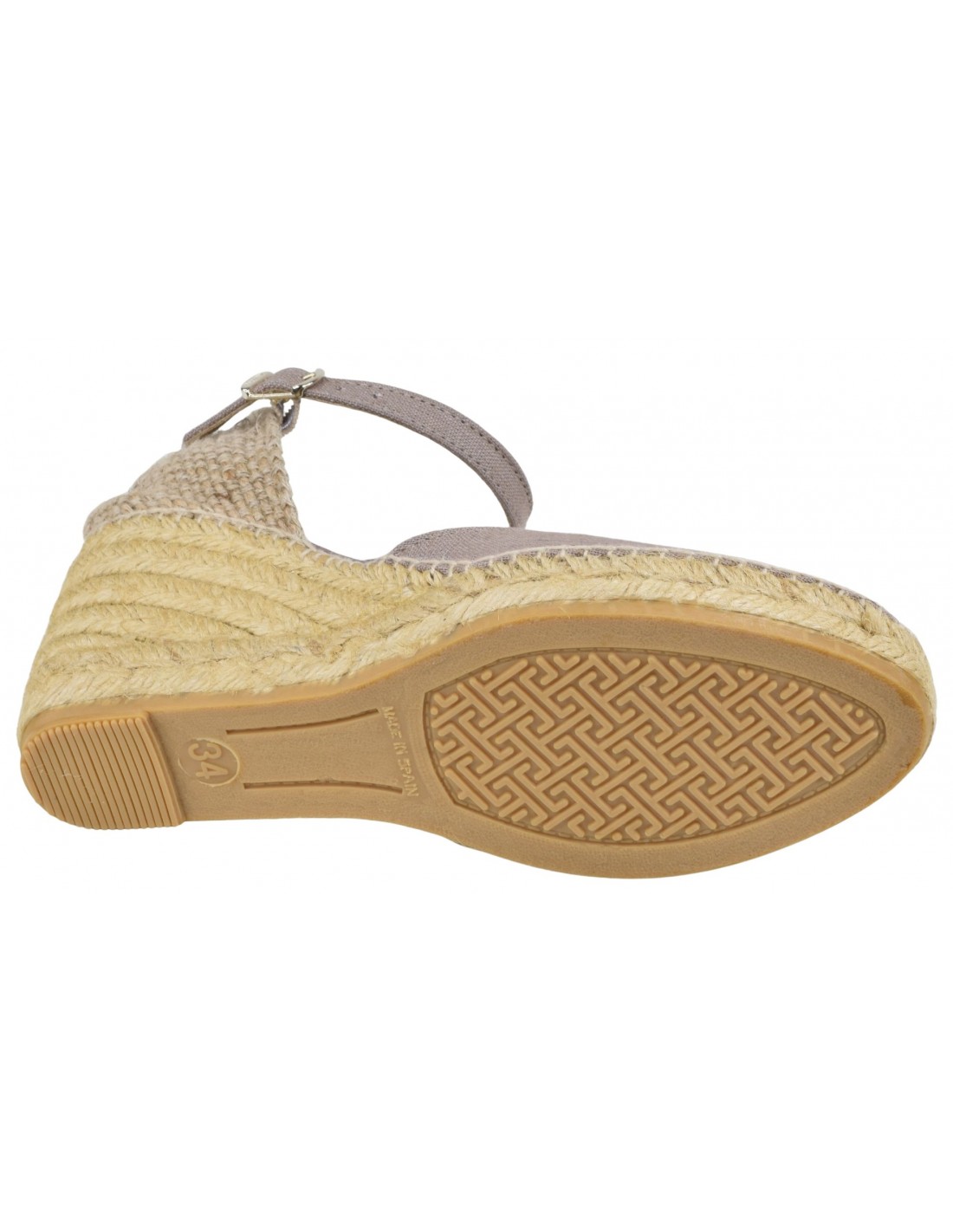 La sandalia Caldes de Toni Pons presenta un tacón de cuña de 7 cm recubierto de yute y una suela de 1,5 cm de grosor. El tacón se siente como si fuera de 5,5 cm al caminar. El empeine es de tela color topo con una tira tipo Mary Jane y cierre de hebilla. La suela es de goma antideslizante. El ancho del zapato es de 7,5 cm.