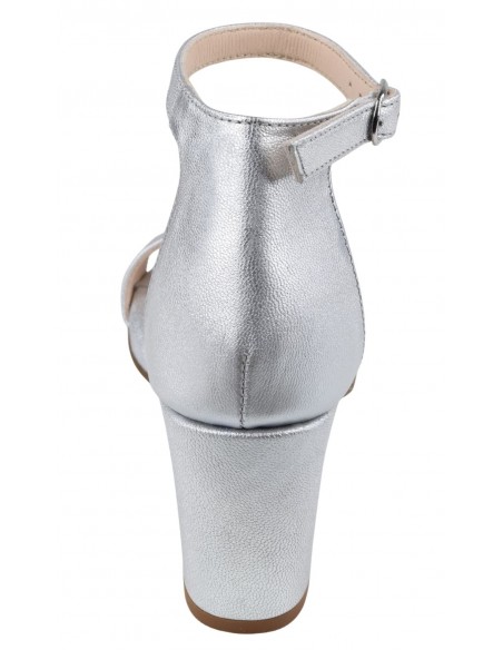 Sandalias de piel plateada metalizada con tacón estable de 7 cm y plantilla acolchada de piel con 3 mm de gel para una comodidad óptima. Ancho estándar: 7,5 cm . Disponibles en tallas 33 y 34 .