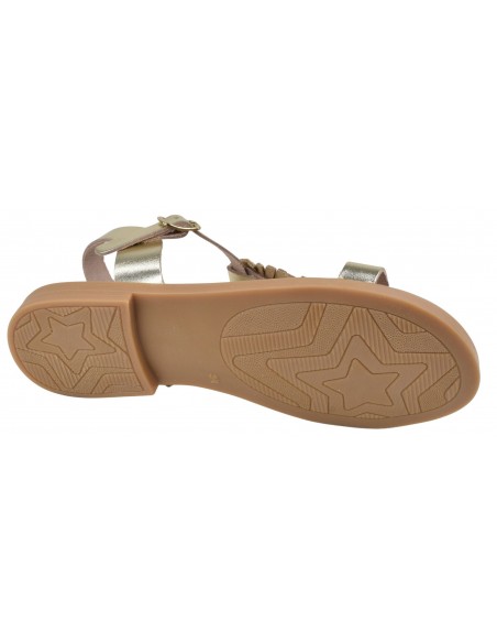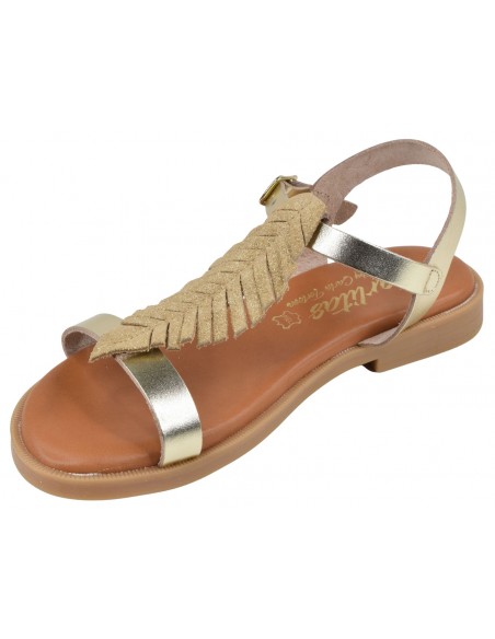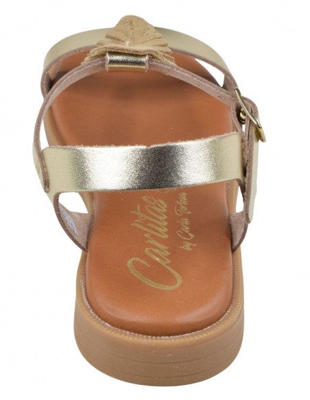 The Carlita 19722 sandal captivates with its luminous and delicate style, perfect for enhancing summer outfits. Its smooth gold leather upper adds a chic and sunny touch, while the decorative beige glittery suede leaf on the instep gives the shoe subtle texture and elegance.