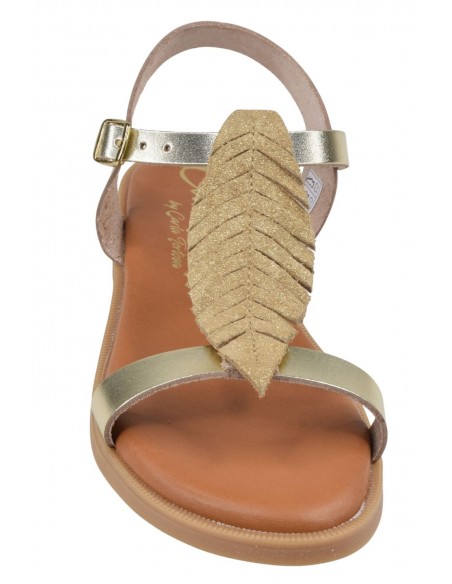 An elegant and luminous sandal, combining gold leather and a glittery beige suede leaf, designed for smaller shoe sizes. Its comfort, cushioned leather sole, and 1.5 cm heel make it an ideal summer style—chic without being over the top.