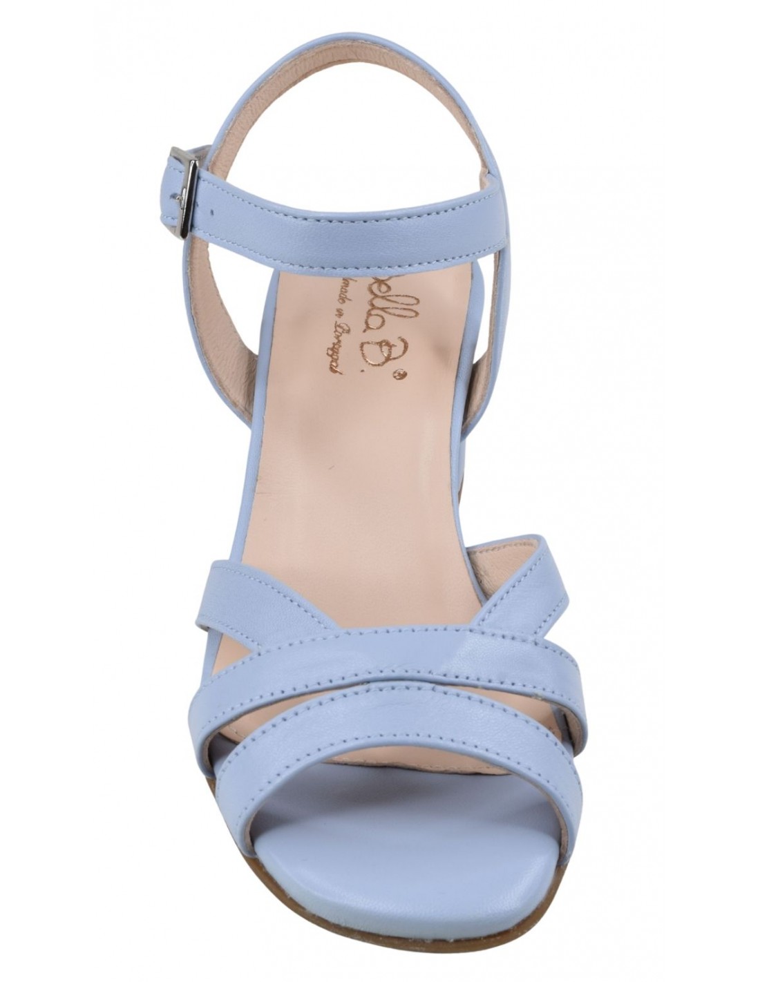 Asterias sandals in smooth sky-blue leather by Bella B. Stable 5.5 cm heel, criss-cross straps at the front, and an adjustable ankle strap. Comfortable style with a 3 mm gel-cushioned leather insole and a flexible outsole. Made in Portugal. Available in small sizes 33 and 34.