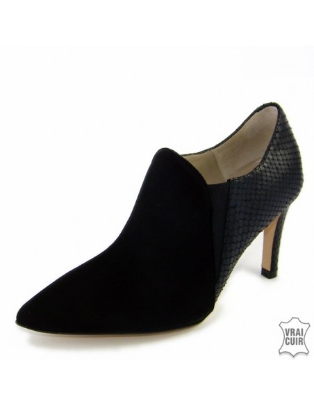 They are in black nubuck on the front then a black elastic separates the back which has a black reptile effect.
