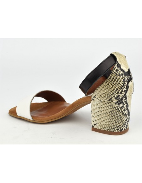 Ces sandales chics pour petits pieds sont montées sur talon épais carré de 5.5 cm enrobé de cuir à motif serpent aux couleurs beige, nude et noire.