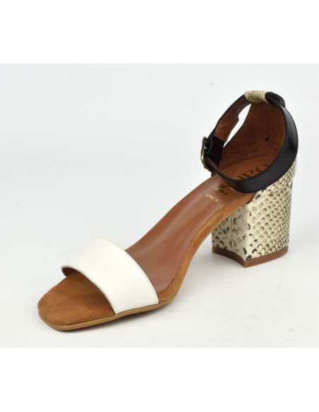 La lanière de la cheville est en cuir lisse noir. La lanière à l'avant de la chausse est en cuir mat blanc La semelle intérieur est doublée en première partie d'un cuir lisse marron placé au dessus d'un enrobage daim camel fonçé. Un modèle élégant et confortable.