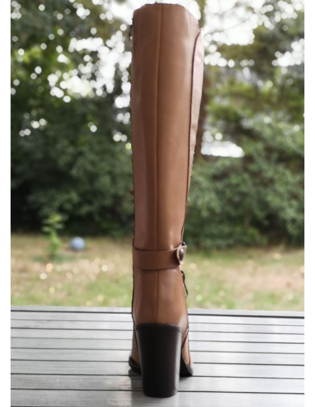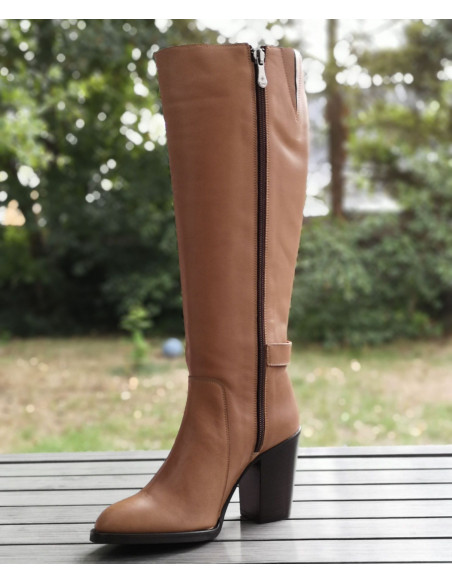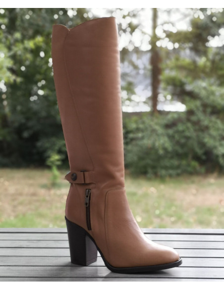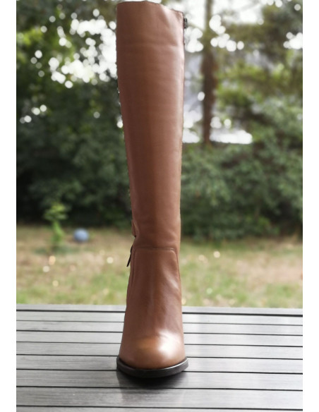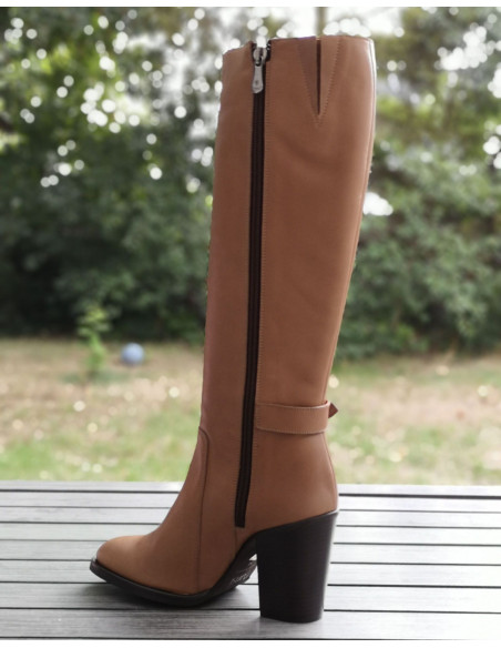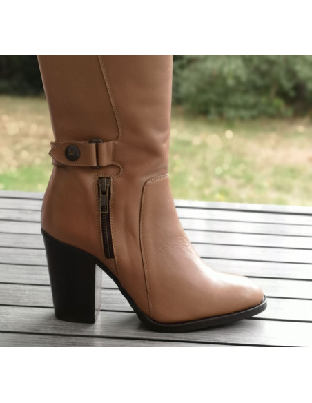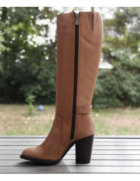 Gli stivali 1881 di Dansi Spain sono montati su un tacco spesso naturale con un'altezza di 8 cm. La sua tomaia è realizzata in pelle liscia color tortora color carne. L'altezza dell'asta è di 35 cm. Il contorno del polpaccio è di 35 cm (non adatto a polpacci magri). La larghezza della calzatura è di 7,5 cm. L'infilatura avviene tramite una chiusura a zip situata all'interno dello stivale.