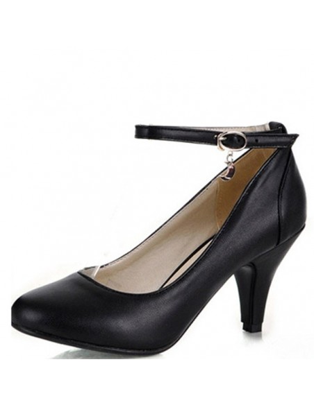Salón negro con tacones pequeños en talla pequeña para mujer. Estas bombas tienen una correa en el tobillo para mantener los pies delgados en la bomba.