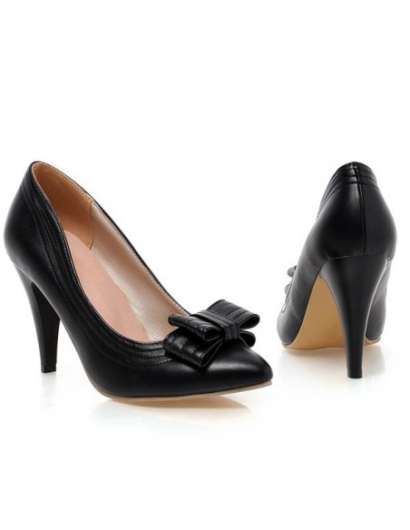 Black pointed toe pumps with bow at heels in a small size for women.