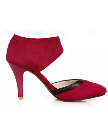 Escarpins rouge et noir aspect nubuck avec large bride autour de la cheville à talons en petite pointure pour femme. La partie rouge sur le dessus du pied a un aspect nubuck et la partie noir un aspect cuir. Le talon est le dessous de la semelle sont rouges.