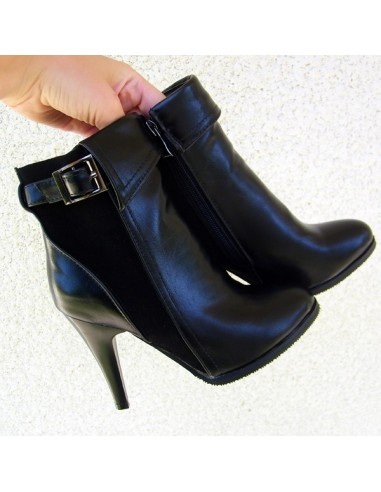 Questi stivaletti bimateriali neri con tacco di 9 cm sono decorati con una fibbia decorativa. Per una facile calzata, gli stivaletti hanno una cerniera nella parte interna del piede.