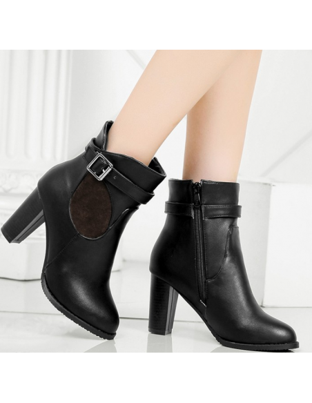 These black ankle boots with 8 cm heels are adorned with a decorative buckle and a nubuck part in the shape of a dark brown drop.