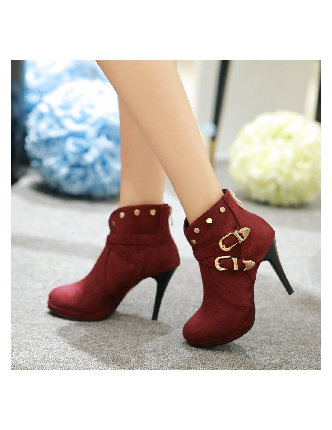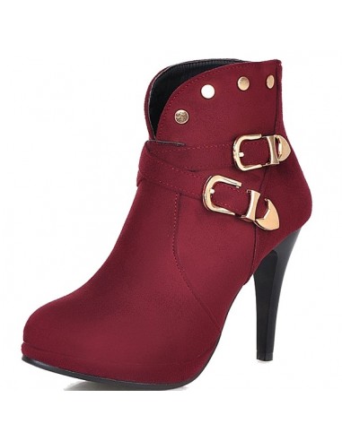 These burgundy red boots with 9.5 cm heels have a 2 cm platform and are adorned with two decorative buckles and 4 small golden buttons around the ankle. For easy donning, the ankle boots feature a zipper at the back of the foot.