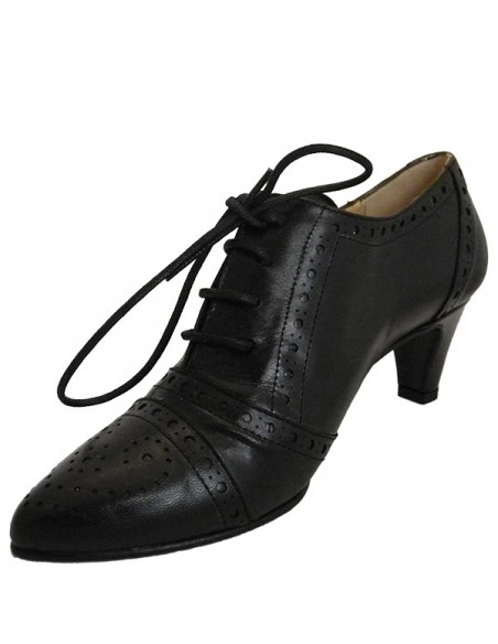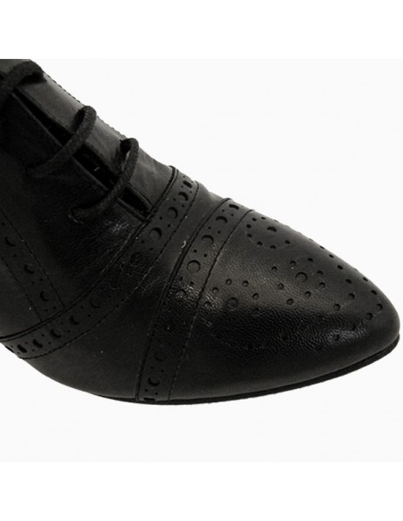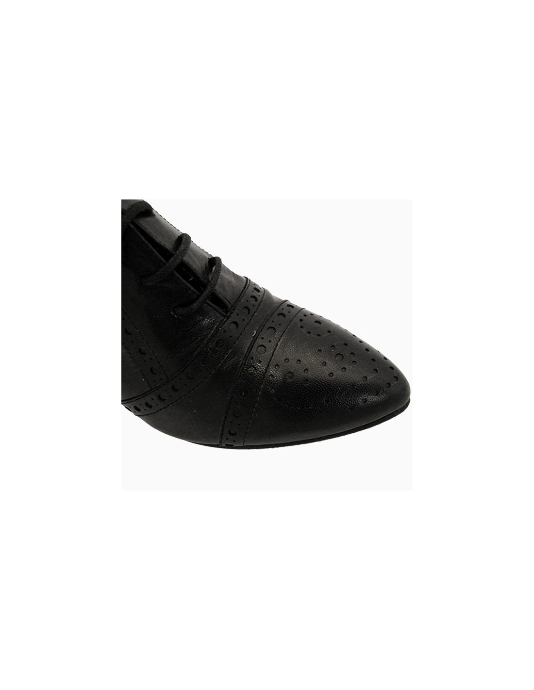 These black leather brogue type shoes are lace up and have a small 5 cm thick heel. These oxfords have a matte appearance dotted with lines of small holes and a pointed toe. This model combines elegance and comfort. These little brogue shoes will go perfectly with your chic outfits, pants or skirts.