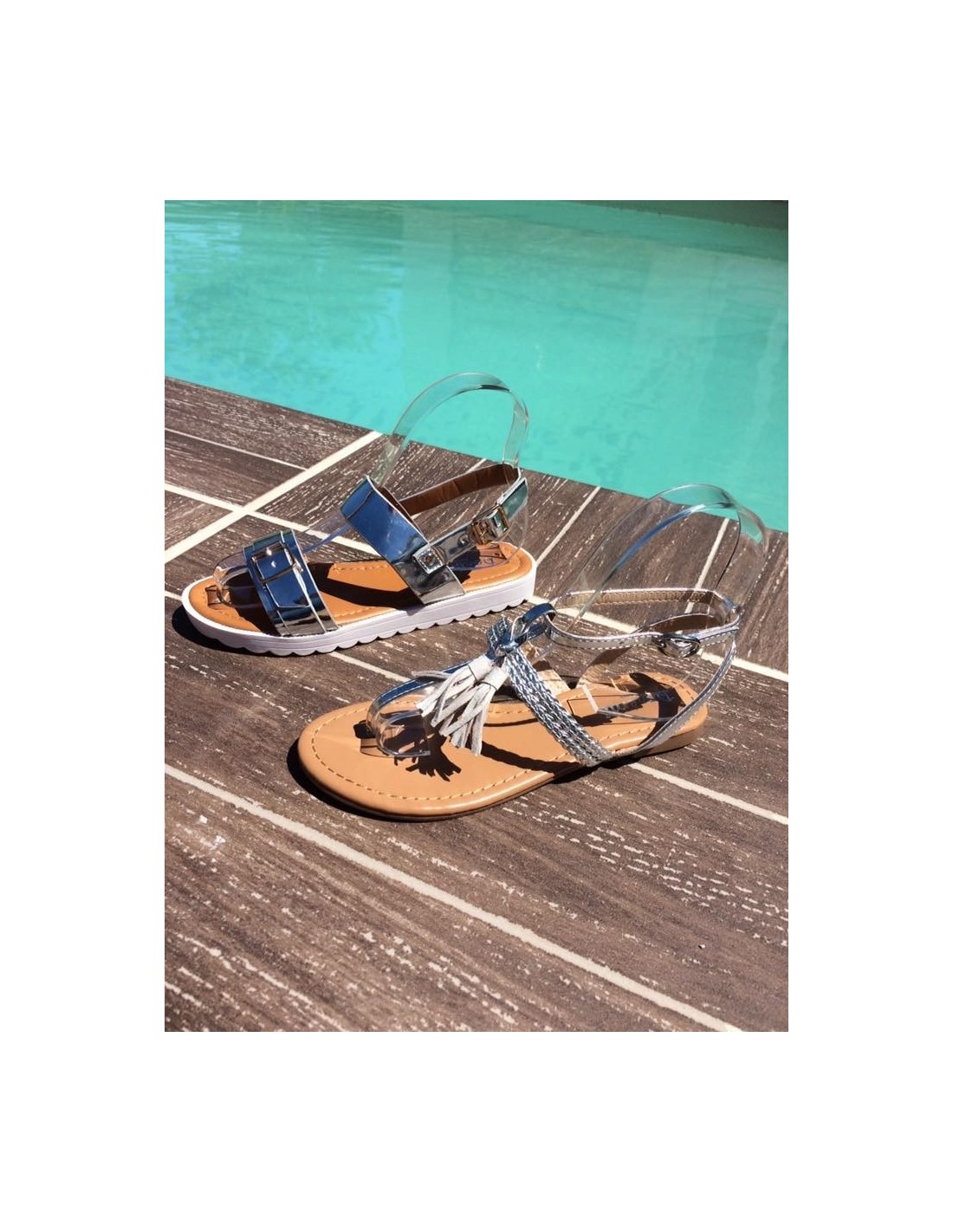 Questi sandali aperti con tacco piatto sono una delle nuove tendenze dell'estate 2016. Il suo colore argento e due nappine effetto nabuk grigio chiarissimo fanno di questi sandali un modello bohémien chic. Il doppio cinturino argentato è intrecciato per aggiungere un tocco di originalità. Questo paio di scarpe da donna è ideale per il trotto in primavera o in estate, in città o al mare. Tendenze e classici; questi sandali possono essere indossati con un vestito, pantaloncini o jeans.