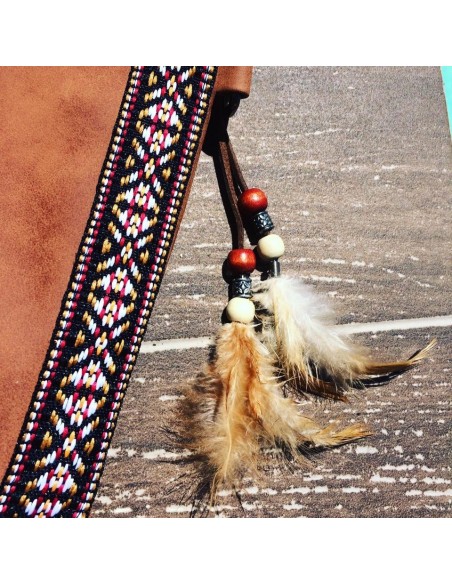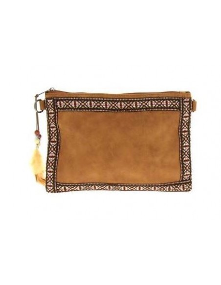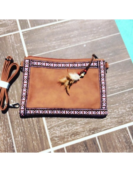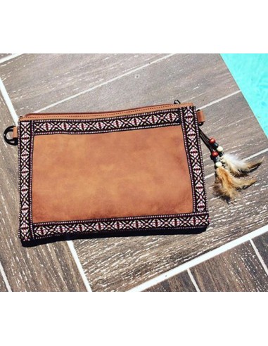 Boho chic camel-colored nubuck pocket with Indian style on the outline.