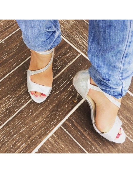 Silver open shoe with a strap on the top of the foot that crosses with the ankle strap on the inner side of the foot.