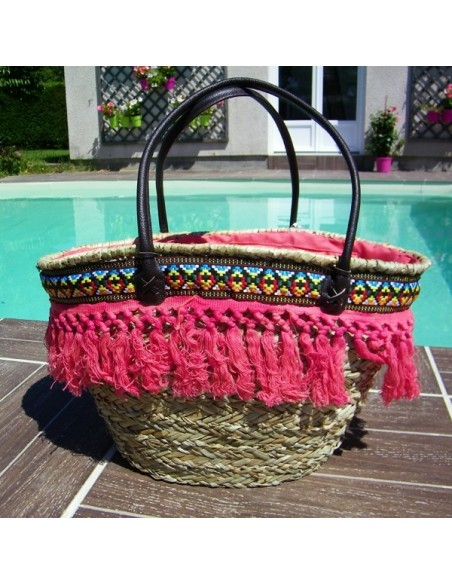 Pink tote bag, this straw tote bag with its fringes and bohemian style, will accompany you everywhere! His interior is lined in fabrics with an interior pocket, the tote closes with a zipper. It has two leather handles.
