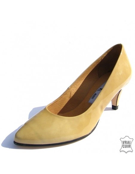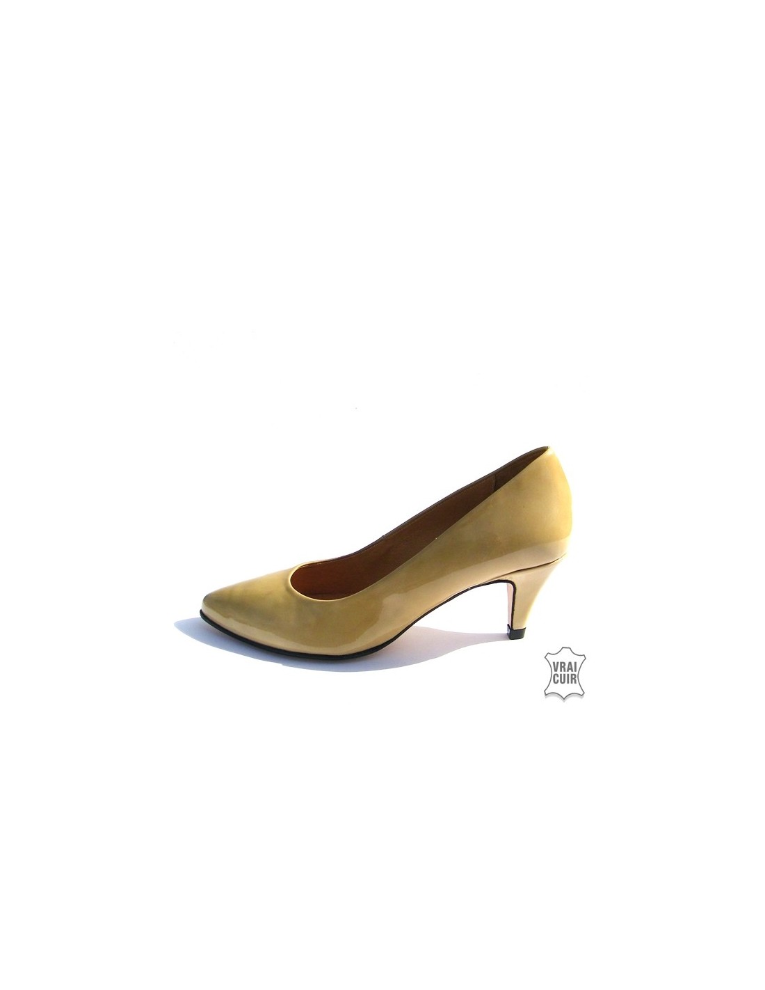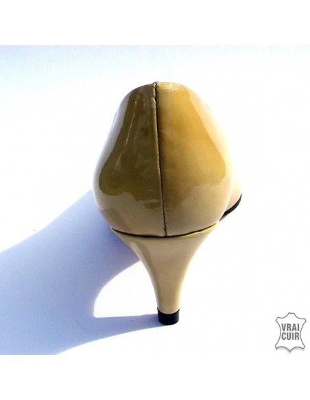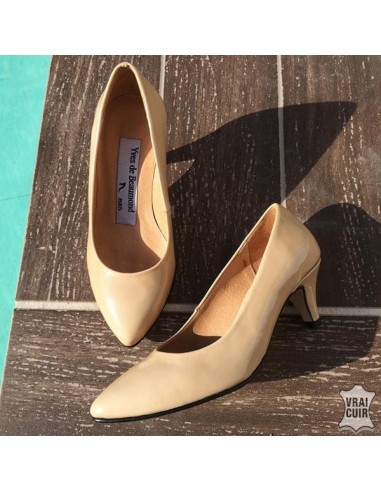 Les escarpins beiges sont en cuir vernis. C'est un modèle entièrement fabriqué à la main en Espagne avec un cuir Italien dans les ateliers de la marque Yves de Beaumond. On aime particulièrement la hauteur du talon fin puisqu'il mesure 6 centimètres, parfait pour de belles gambettes élancées.