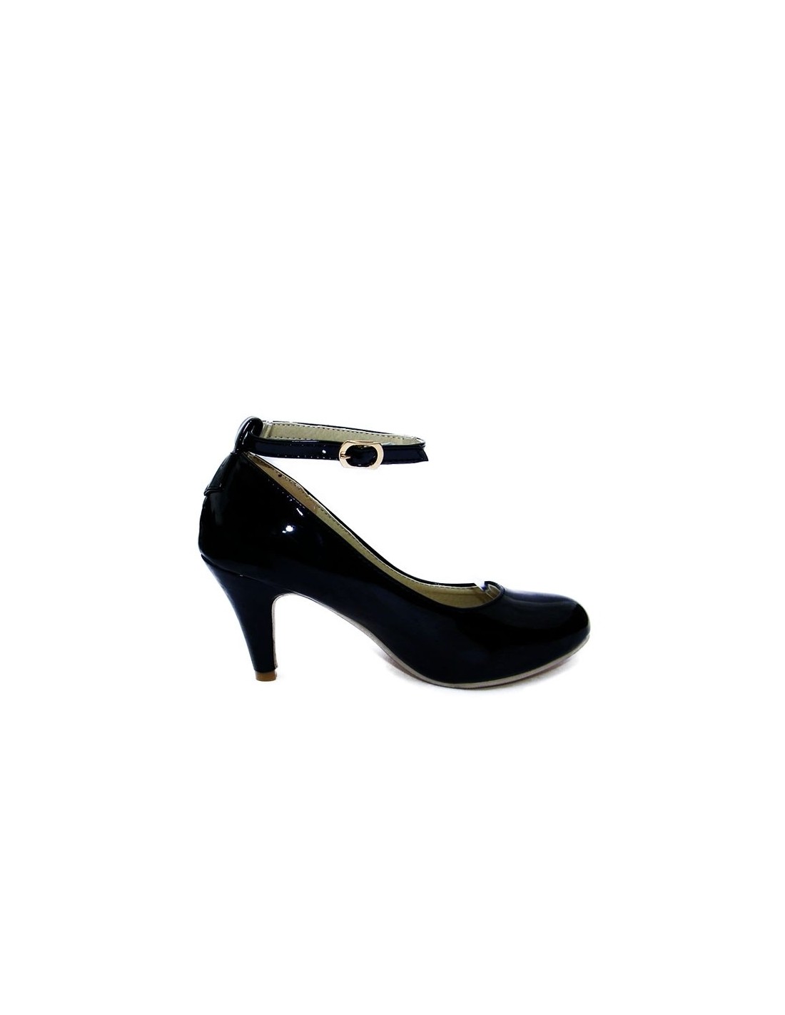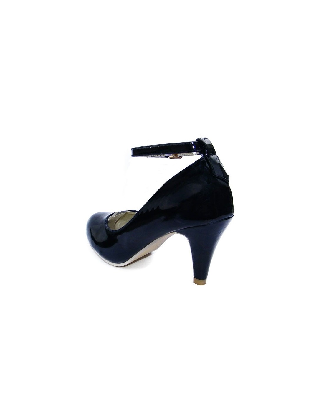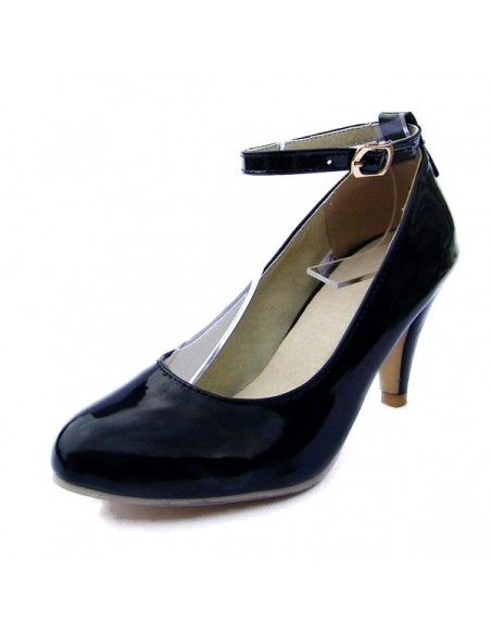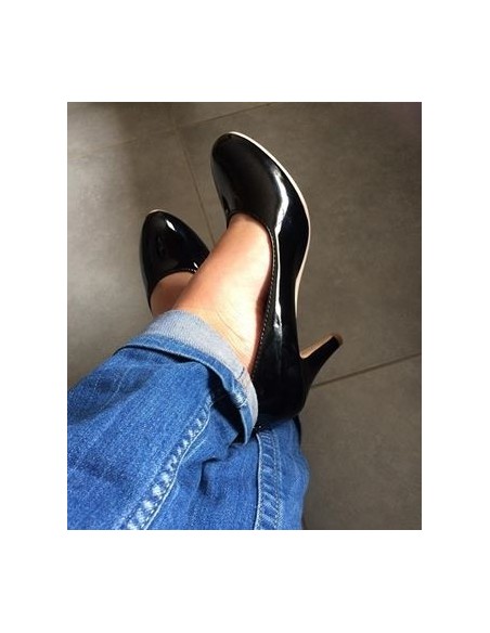 Ces escarpins en aspect vernis noir sont dotés d'une bride de cheville , afin de maintenir votre pied dans l'escarpin.