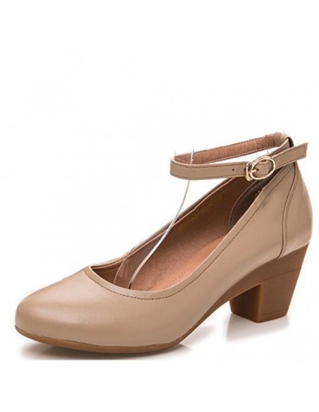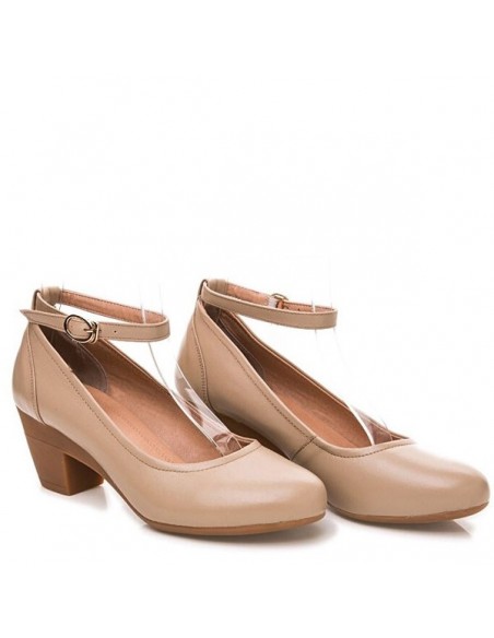 These soft beige pumps are walker type shoes with a 5 centimeter thick heel and ankle strap for good stability and comfort.