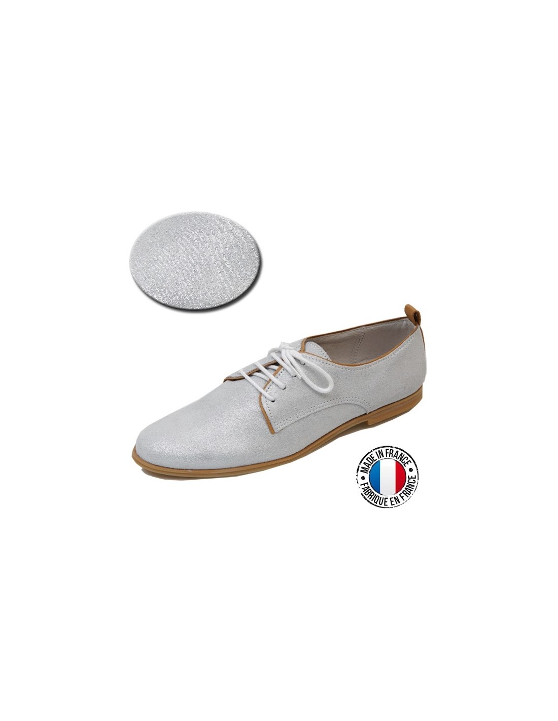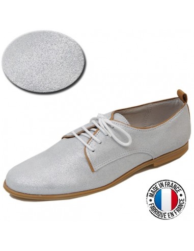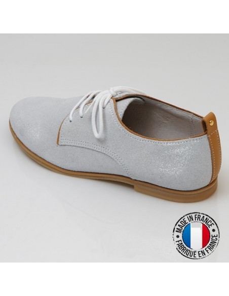 Derbies argentées à lacets en véritable cuir. Ces derbies très chics sont des chaussures Made in France fabriquées par la marque Bellamy (spécialiste de la chaussure enfant).
