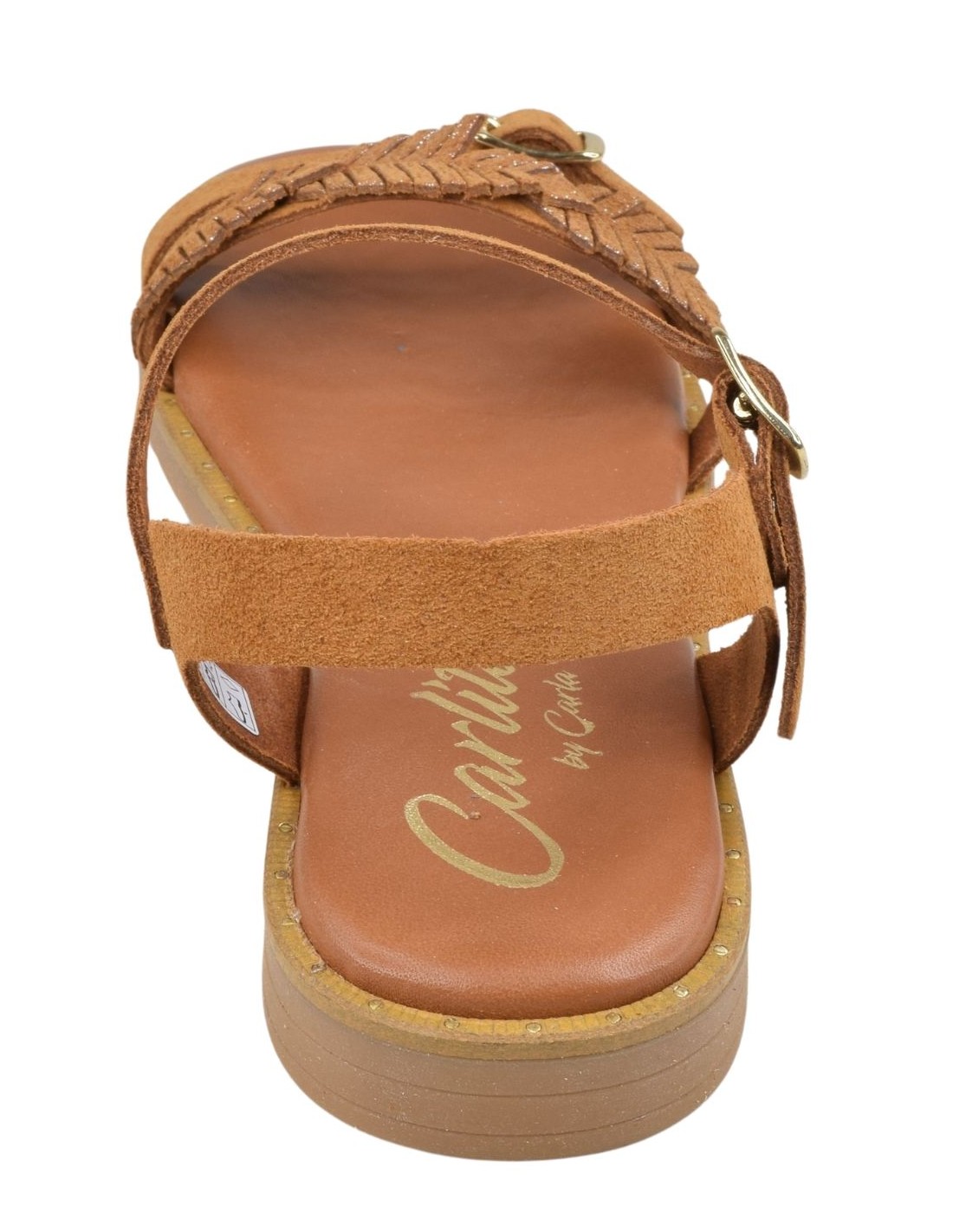 Sandali bassi Carlita 195735 in camoscio color cognac, con piccolo tacco di 1,5 cm, adatti a scarpe da donna di piccole dimensioni dal 32 al 35.