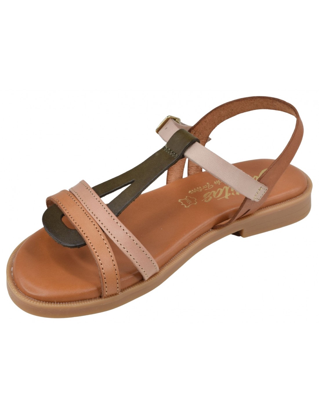 Nella parte anteriore, i cinturini in pelle liscia avvolgono delicatamente il piede, mentre la fascia centrale color cachi allunga visivamente la silhouette e aggiunge un tocco di carattere discreto.