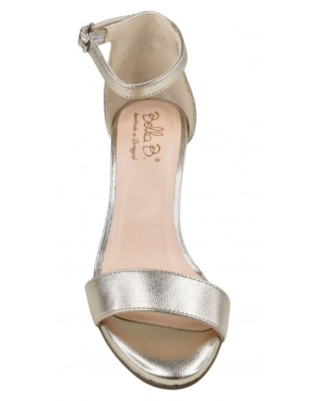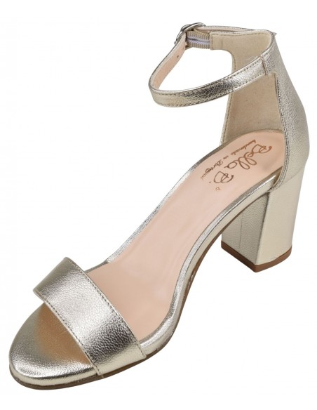 Sandali in pelle dorata, modello Blandy di Bella B. Tacco 7 cm, soletta interna in pelle ammortizzata con gel da 3 mm, suola esterna in gomma flessibile. Larghezza 7,5 cm. Disponibili nelle taglie 33 e 34.