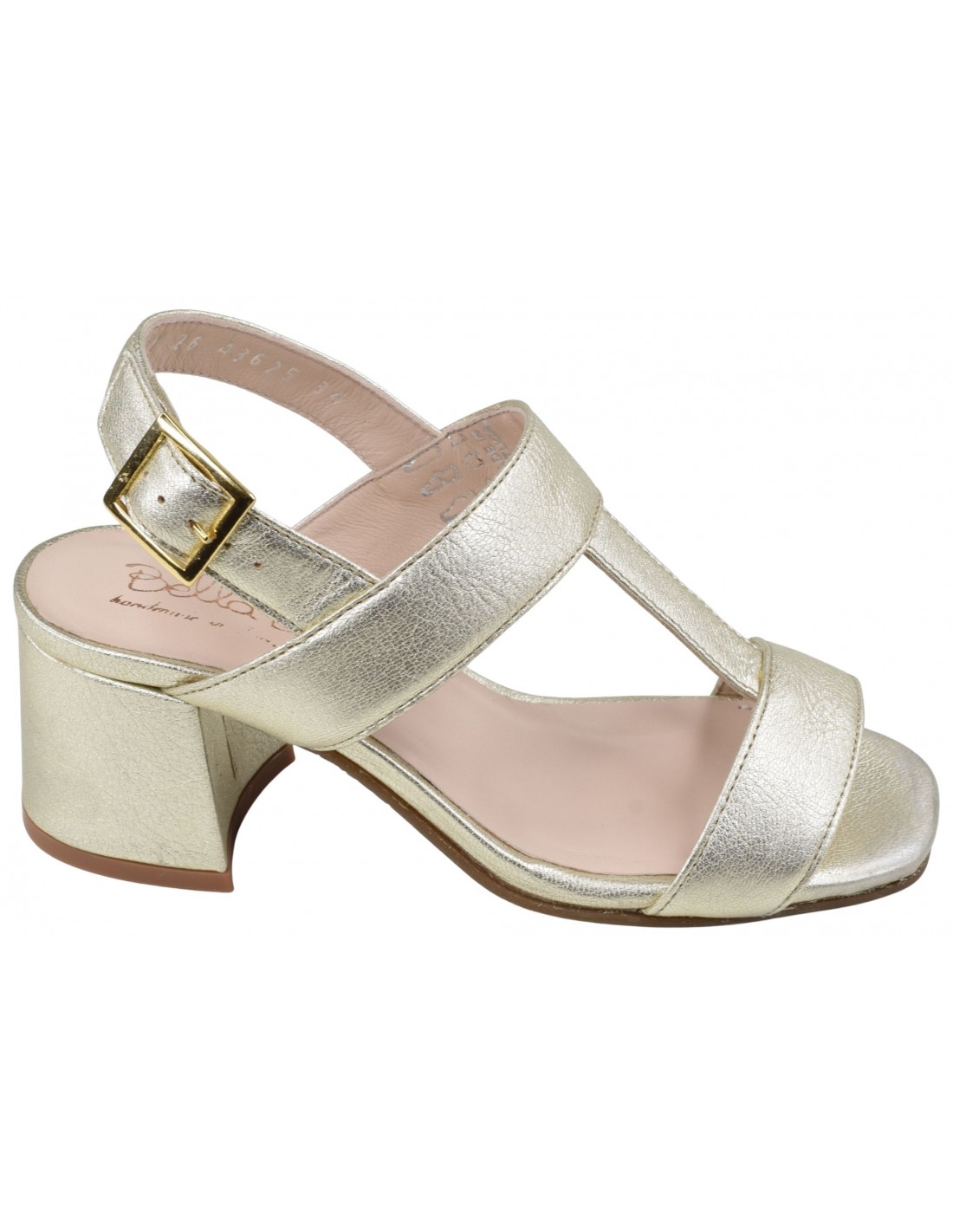 Eleganti e luminosi sandali da donna in pelle metallizzata color oro, caratterizzati da un robusto tacco a blocco di 5,5 cm. Uno stile raffinato e confortevole, pensato appositamente per le taglie più piccole, 33 e 34.