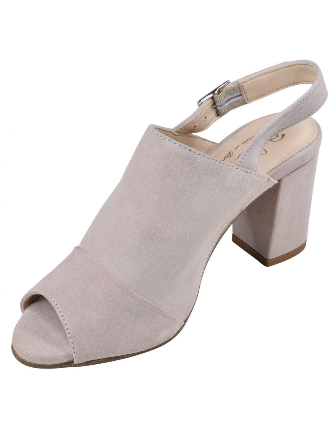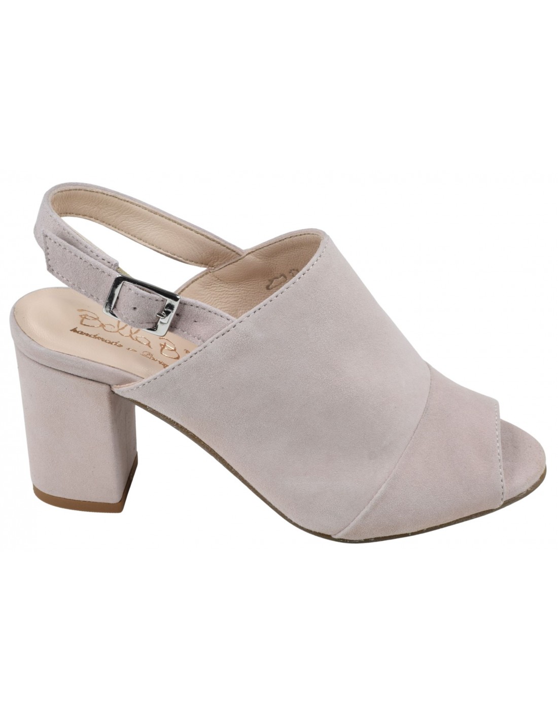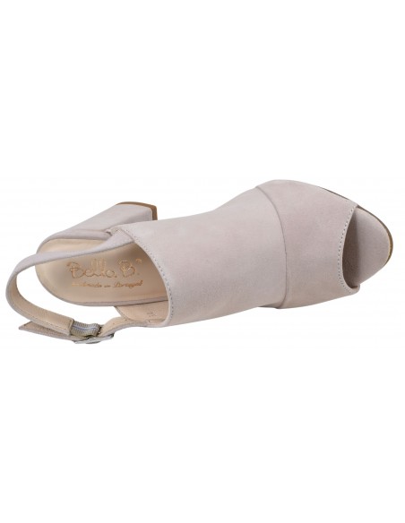 Eleganti e moderni sandali con tacco in camoscio color carne, con ampia tomaia avvolgente e cinturino posteriore regolabile. Tacco a blocco coordinato di 7 cm. Adatto a scarpe da donna di taglia 33 e 34. Modello Bella B, prodotto in Portogallo.
