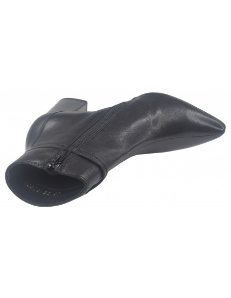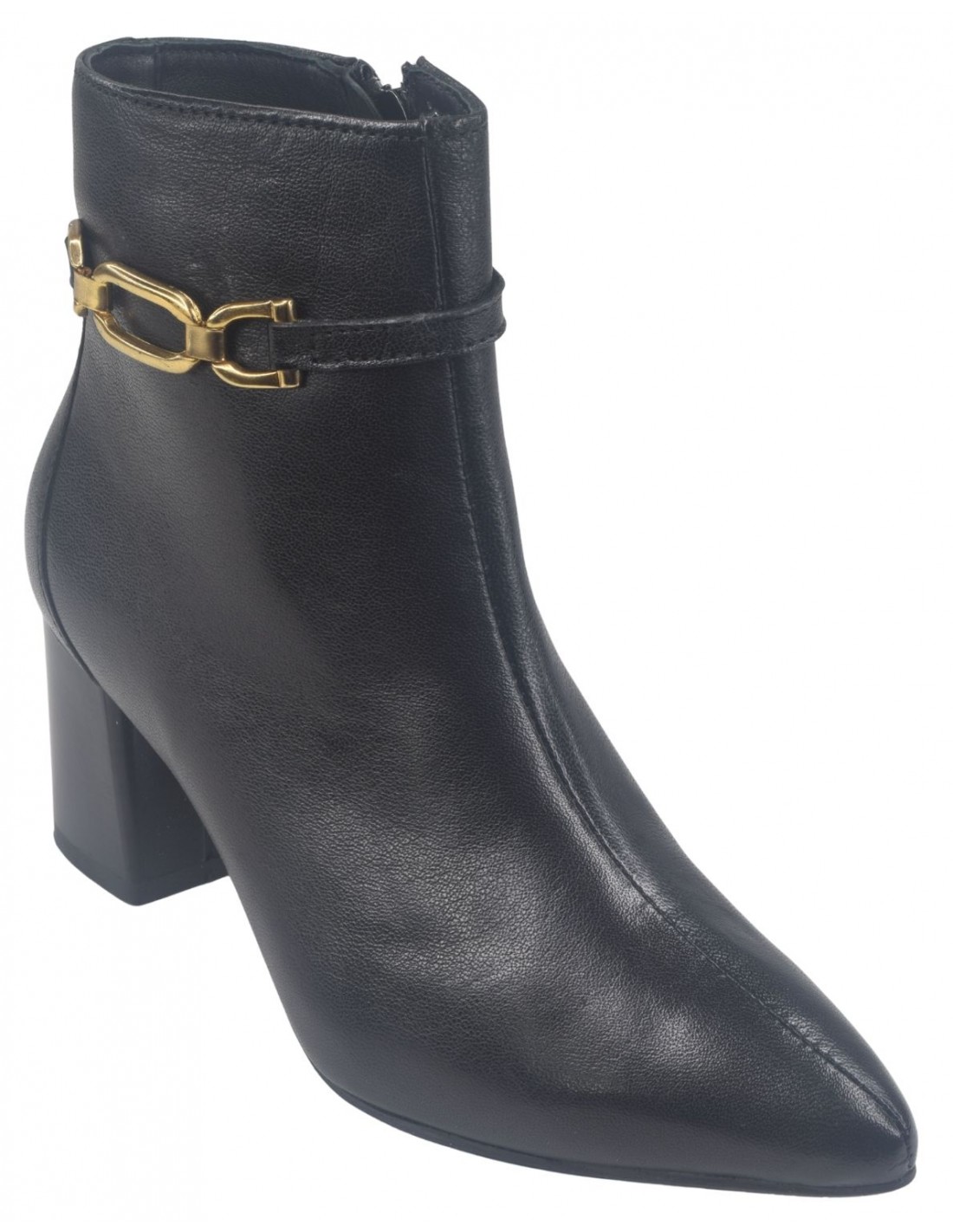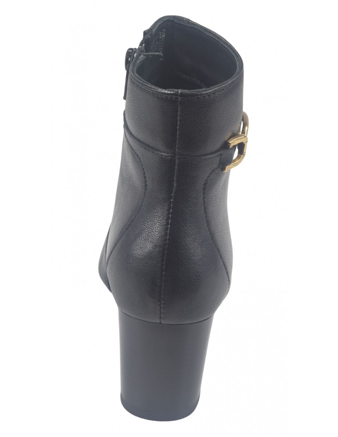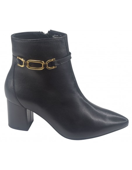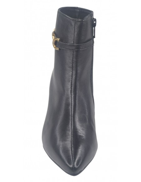 Sa tige est composée d'un cuir lisse noir d'une hauteur de 11.5 cm. Le contour cheville (mesure prise en haut de la tige sur une pointure 34) est de 24 cm. L'enfilage se fait facilement avec une fermeture éclair située côté intérieur de la bottine. La semelle intérieure est doublée de cuir. La semelle extérieure est en gomme de haute qualité. La largeur de son chaussant est de 7.5 cm (Largeur standard). Son bout est pointu. Décoration chaîne dorée sur le côté.