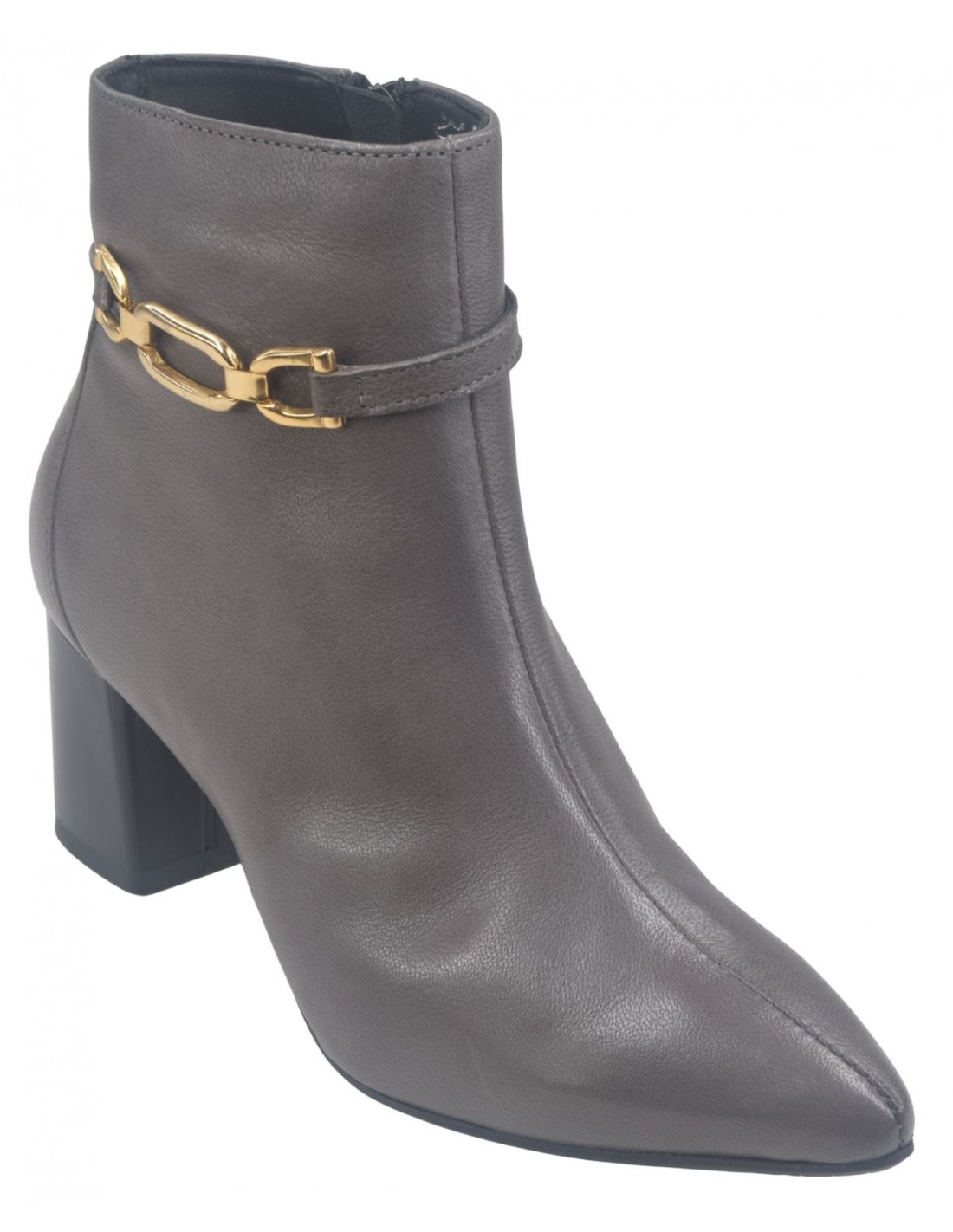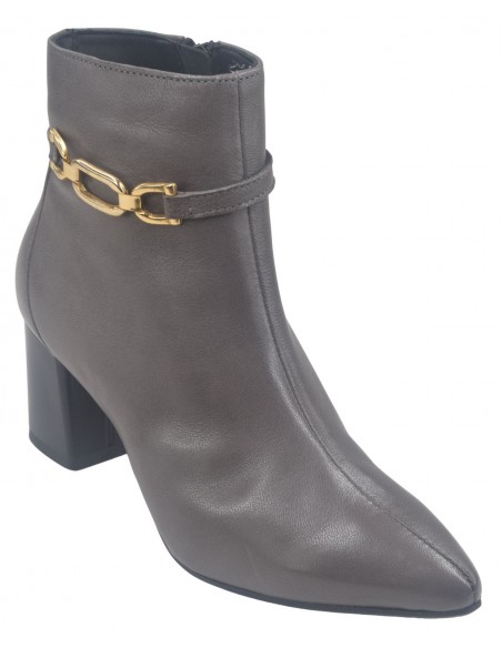 Sa tige est composée d'un cuir lisse gris d'une hauteur de 11.5 cm. Le contour cheville (mesure prise en haut de la tige sur une pointure 34) est de 24 cm. L'enfilage se fait facilement avec une fermeture éclair située côté intérieur de la bottine. La semelle intérieure est doublée de cuir. La semelle extérieure est en gomme de haute qualité. La largeur de son chaussant est de 7.5 cm (Largeur standard). Son bout est pointu. Décoration chaîne dorée sur le côté.